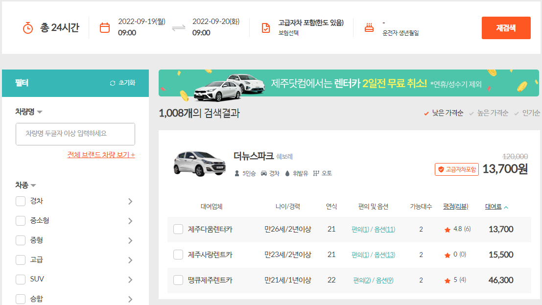 렌트카 검색 결과 최저가 렌트카가 검색되었습니다.