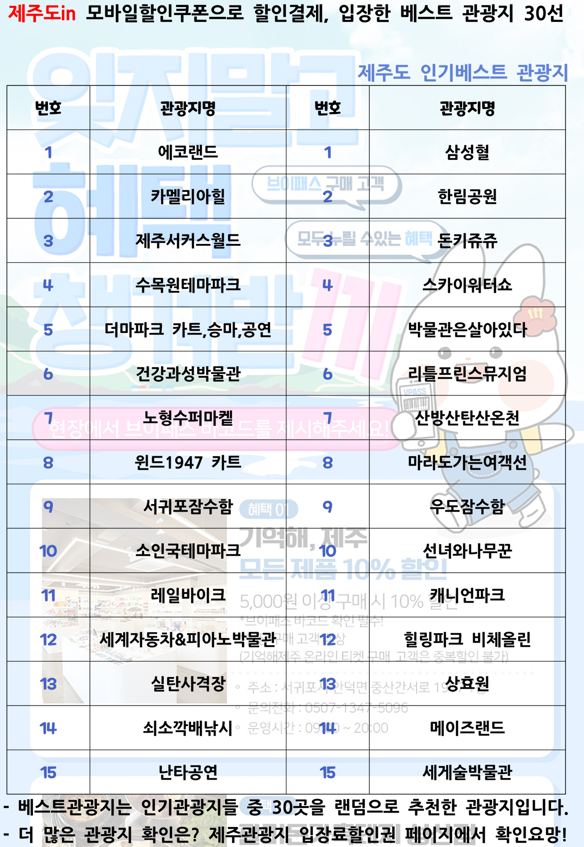 제주도 가볼만한곳 30선 관광지 확인하시고, 제주할인권(할인쿠폰)