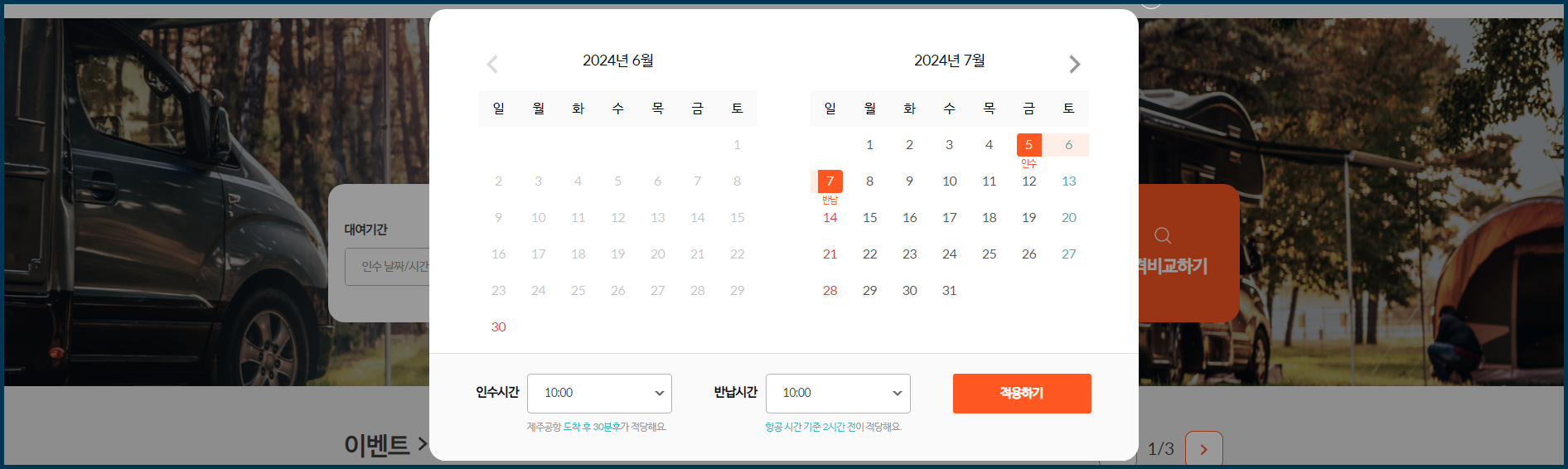 제주렌터카 최저가 비교를 위한 대여기간(일정)을 선택하시면 됩니다.