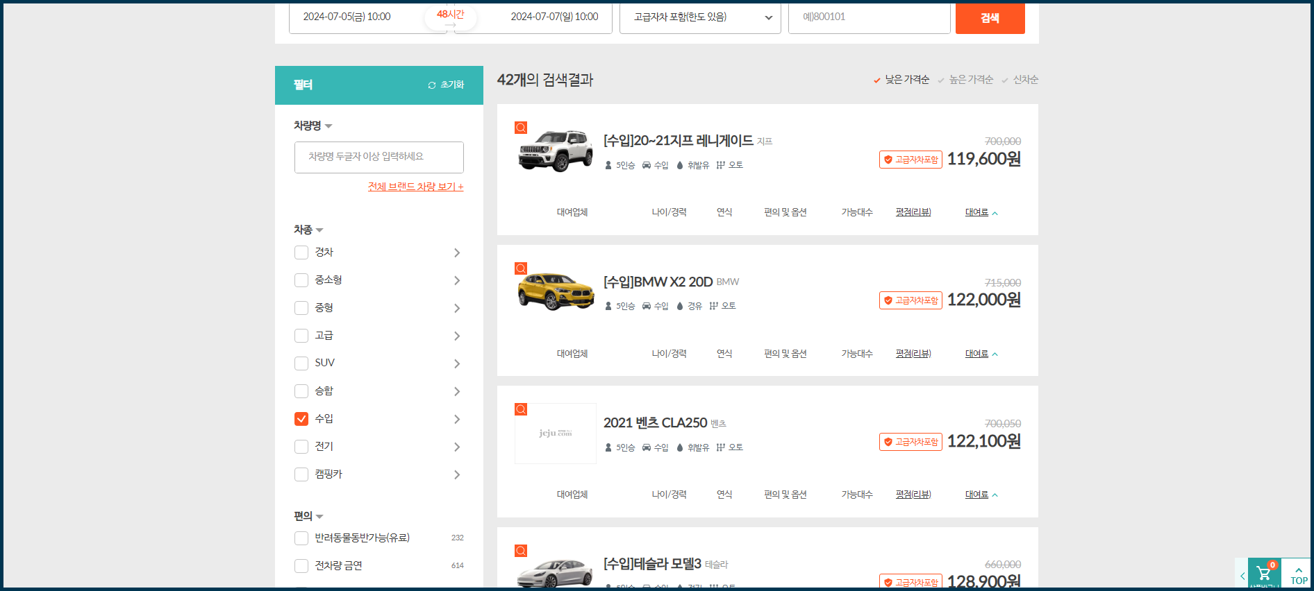 7월 첫주 주말여행을 위한 렌터카 최저가 낮은 각겨순으로 검색되었네요.