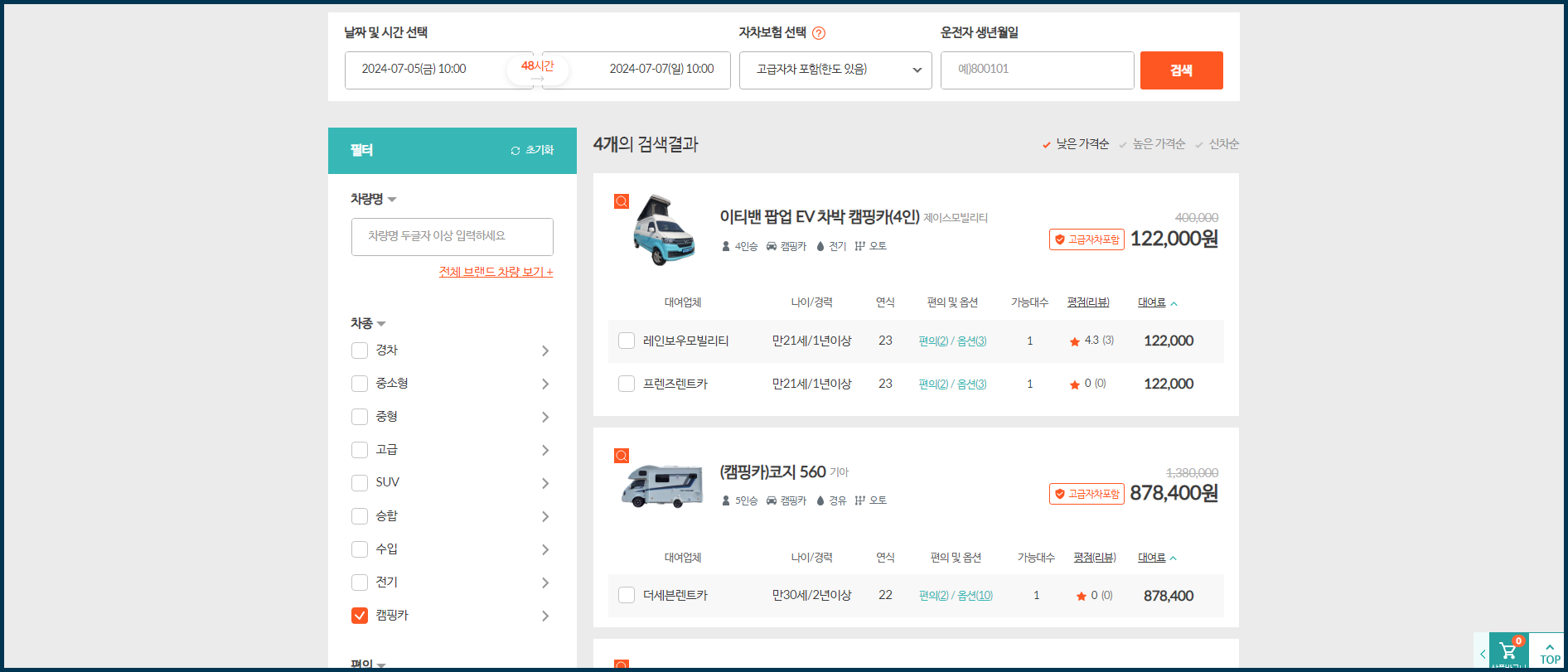 최저가 비교했어요. 최저가 차량은? 12만원대이구요~ 87만원대 캠핑카도 있네요.