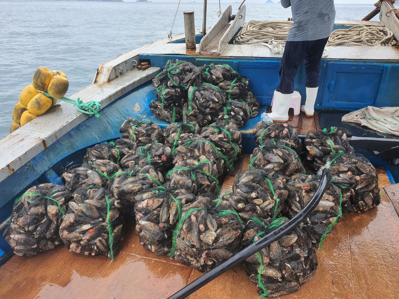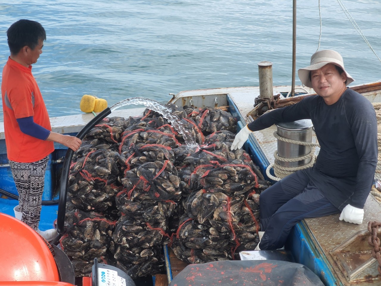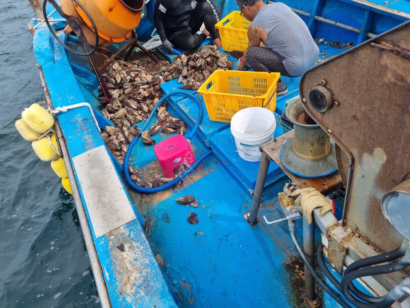 추자도 생산자께서 참홍합(섭) 채취하여 선상에서 작업하는 사진입니다.