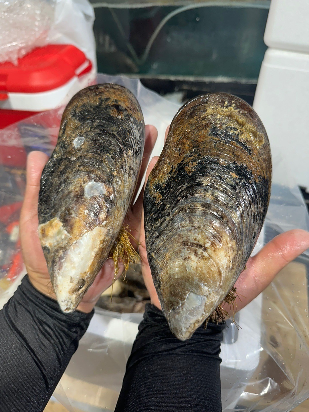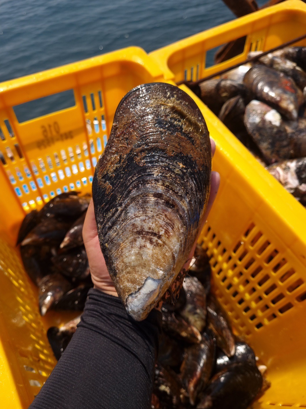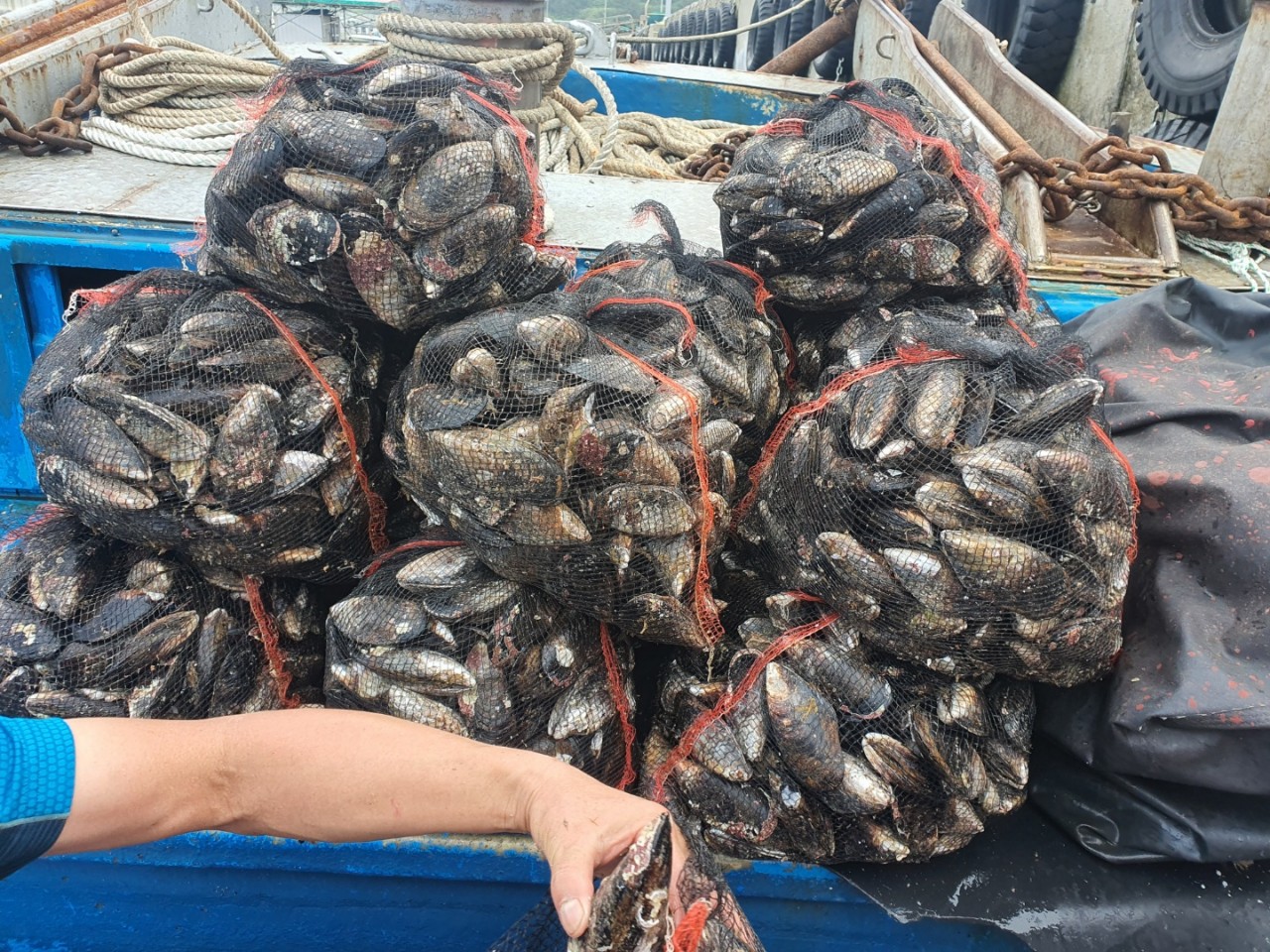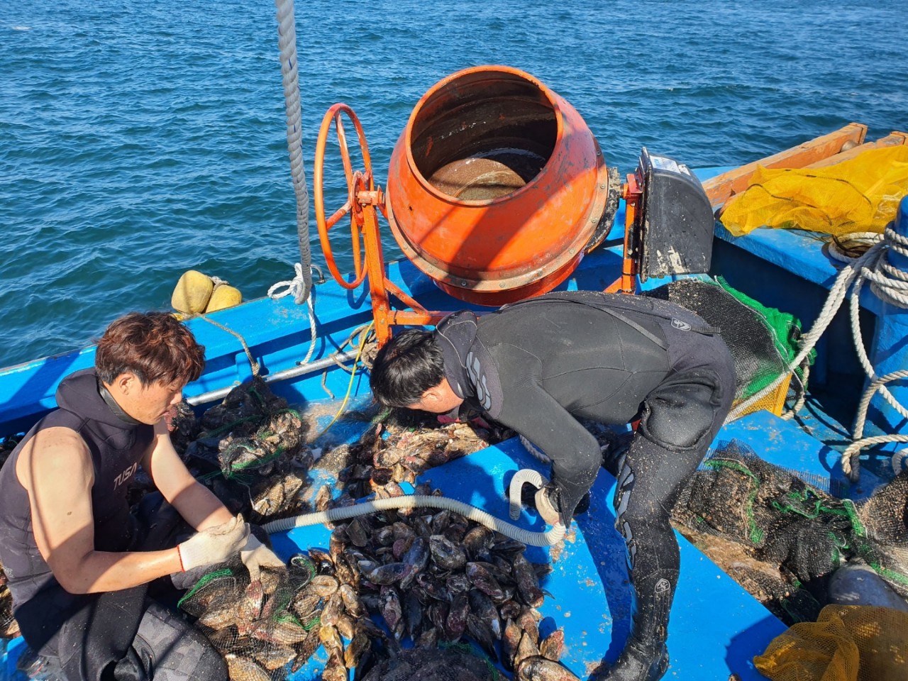 추자도 생산자께서 참홍합(섭) 채취하여 선상에서 작업하는 사진입니다.