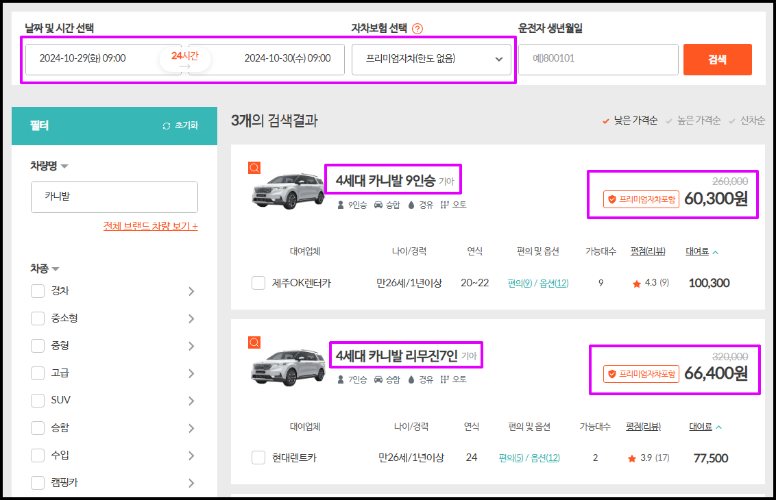 주중 평일 제주여행 하시는 분들께서는? 4세대 카니발 최저가 비교검색 하시고 원하는 제주렌트카 차량을 온라인예약