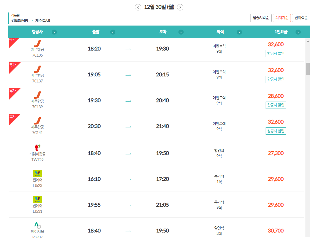 12월 30일 월요일 제주도 항공권(김포-제주) 최저가 가격비교 정보 입니다.