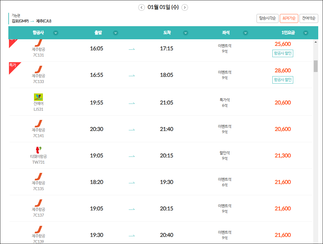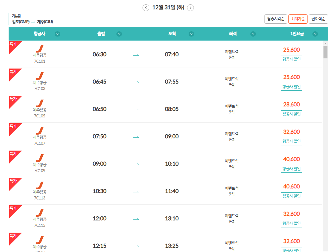 12월 31일 화요일 제주도 항공권(김포-제주) 최저가 요금은?