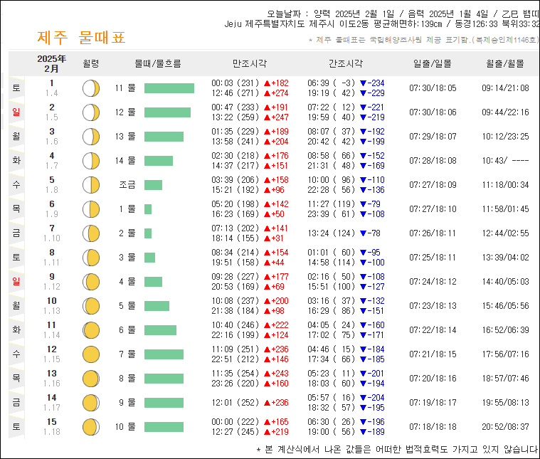 2월1일~2월15일까지 제주도 물때표 입니다.