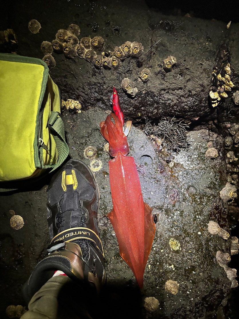 일찍이 갯바위에 진입 후 늦게 들어오신 한치 찌낚시 조사님께 한쪽 자리를 양보하고 둘이서 사이좋게 의논하여 한치 낚시를 시작했어요. 해당 갯바위 부근에서 필자가 가장 먼저 한치를 한마리 히트했구요. 두번째 히트는 대포한치가 올라왔어요. 조류가 잘 가는 상황인데 속조류는 그닥 잘 가지 않았어요. 저킹을 하는 중에 속조류가 빠른 구간에서 한치가 2마리 히트되었습니다. 그렇게 한치 낚시를 일찍이 종료했네요. 한치를 잡지 못한 찌낚시 조사님께 편안하게 낚시를 하실 수 있도록 배려한 상황이었습니다. 그리곤 무늬오징어 에깅을 했는데 역시나 제주시내권에서는 무늬오징어 입질은 커녕 보이지도 않는 상황입니다. 모든 에깅조사님들이 무늬오징어를 잡으려 열심히 흔들고 있지만, 그러나 무늬오징어는 들어오지 않았거나 또는 입질 자체를 하지 않은 것이 현재 시기입니다.