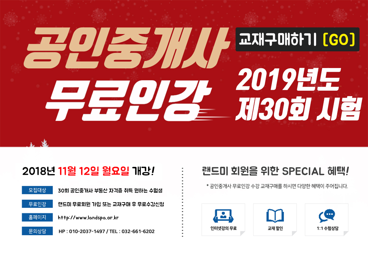 접속방문하셔서 먼저, 무료회원가입 하시고 무료인강과 강의교재를 확인하신 후, 교재구입하시고 무료인강 자유신청 하셔서 공인중개사 시험공부 시작하세요.