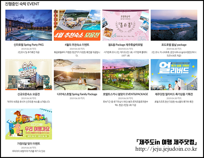 『제주도in 여행 제주닷컴』 제주여행전문 사이트 여행홈페이지 접속방문하셔서 "이벤트" 카테고리 메뉴를 클릭하시면 숙박이벤트가 다양하게 진행되고 있는 것을 보실 수 있구요, 궁금하신 이벤트를 클릭하셔서 이벤트 내용을 확인 후 이벤트 참여하시면 더 재밌는 제주도 가족여행을 예약하실 수 있습니다.