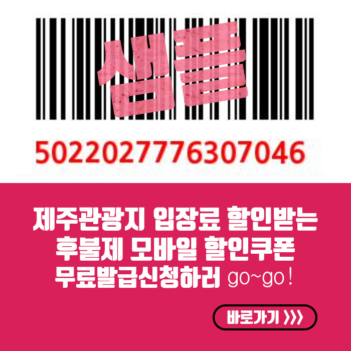 . 제주도 관광지 입장료 매표소에서 할인받고 결제하고 입장하실 분들은? 제주모바일 후불할인쿠폰 (=바코드)을 무료신청 후 스마트폰에 바코드 무료다운 받아서 입장하는 관광지 매표소에 제시하면 자동할인결제 입장합니다.