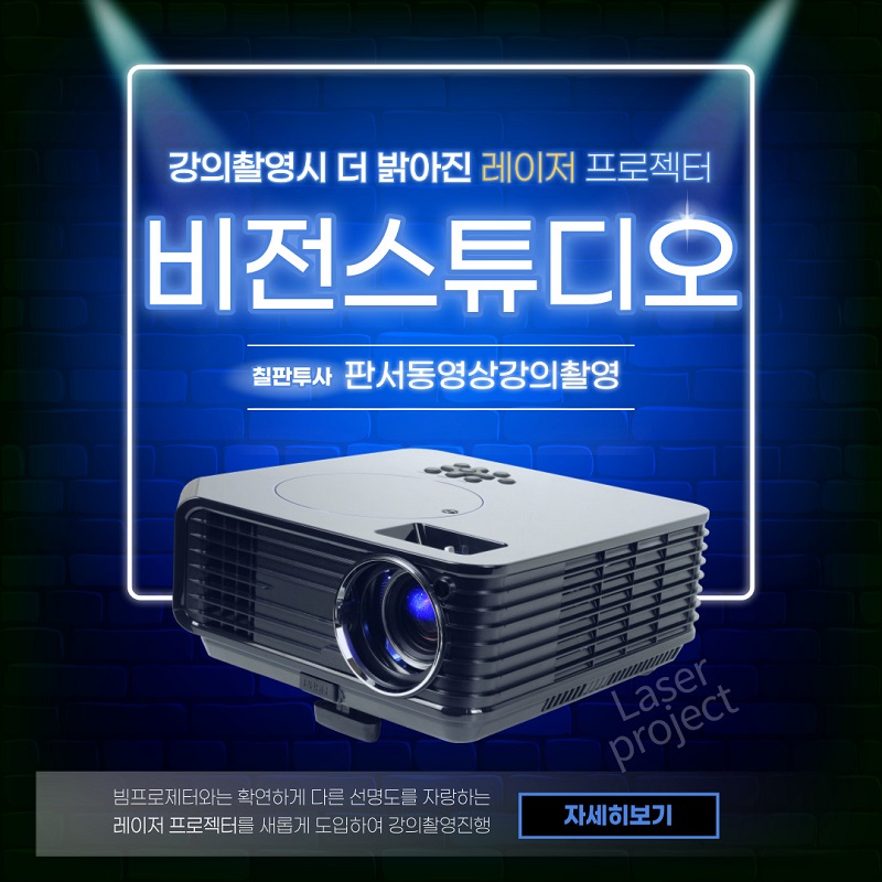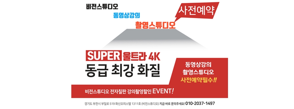 전자칠판 판서강의 영상촬영 상담전화 하셔서, 강의촬영비 및 강의촬영예약 하시고, PPT 등 강의자료 제작안내 확인 후, USB에 자료를 담아서 방문하시면 바로 강의촬영 제작에 들어가게 됩니다. 전자칠판 등 강의촬영을 전문으로 제작하고 있는, 비전스튜디오를 포털사이트에서 검색하시면, 바로 스튜디오 홈페이지 방문하시게 됩니다. 비전스튜디오에서 강의 영상 촬영 제작할 수 있는 장비는? 전자칠판 / 레이저프로젝터 / 빔프로젝터 / 분필판서(녹색칠판) 촬영이 가능합니다. 그리고, 카메라 등 촬영 장비는? 소니 4K캠코더 / 소니 양방향 송수신 무선마이크 / 자료넘기는 프리젠터 포인터 / 분필 / 칠판지우개 등 강의 영상촬에 필요한 모든 장비를 구비하고 있으니~ 여러분들은, 강의자료만 잘 챙겨서 방문하시면... 바..
