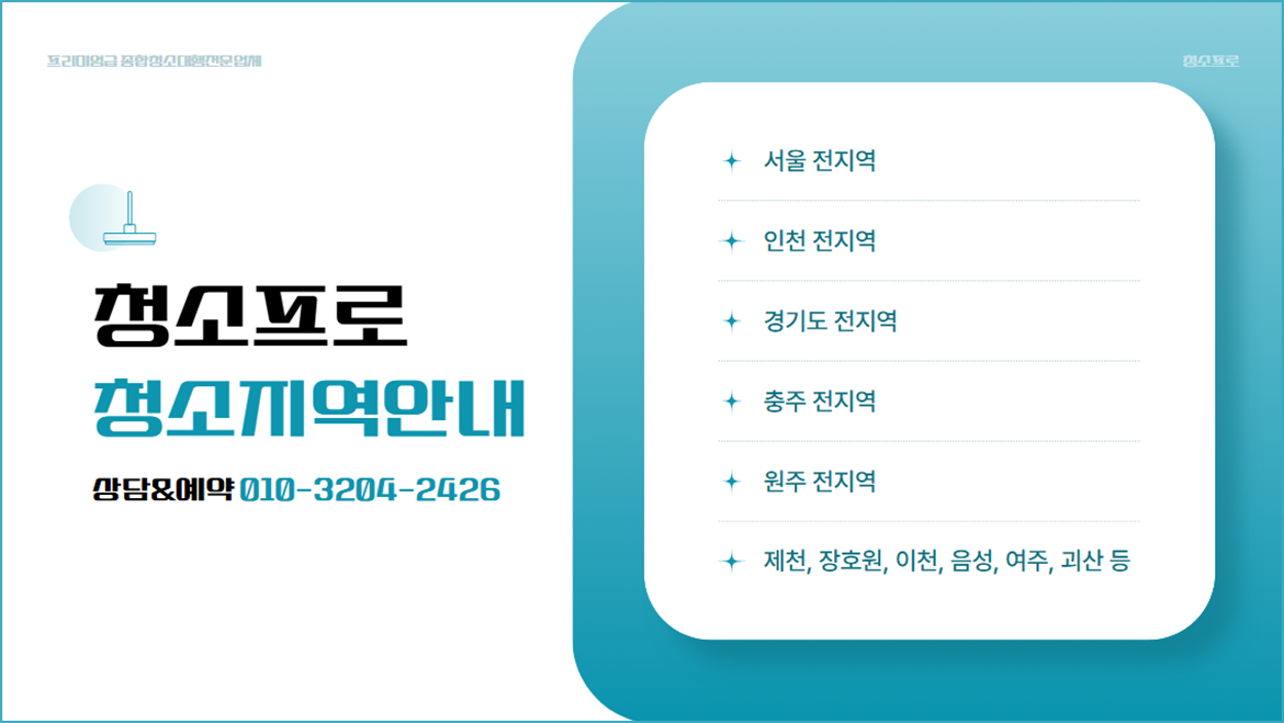 서울, 인천, 경기, 충주, 원주 및 주변 도시 지역들의 청소작업 시공하고 있습니다.